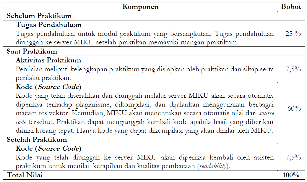 Praktikum ini terdiri atas empat belas (14) modul praktikum. Perhitungan indeks akhir akan dilakukan berdasarkan jumlah nilai dari seluruh modul praktikum yang kemudian dibandingkan dengan statistik perolehan nilai seluruh peserta praktikum. Setiap modul memiliki komposisi penilaian sebagai berikut.