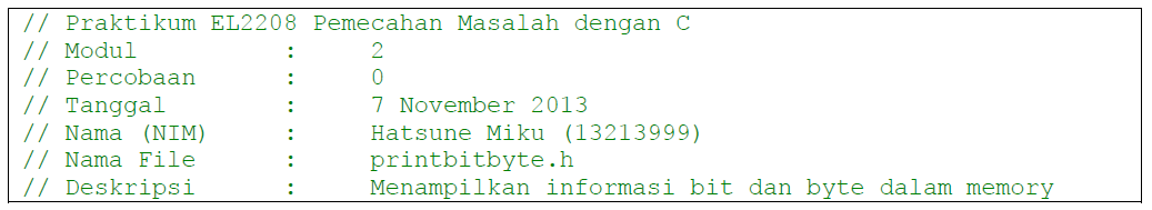 Setiap kode program harus diberi header dengan menyesuaikan modul, percobaan, tanggal, nama praktikan, NIM praktikan, nama file, dan deskripsi singkat program. Untuk kode dalam bahasa C, header didefinisikan sebagai berikut.
